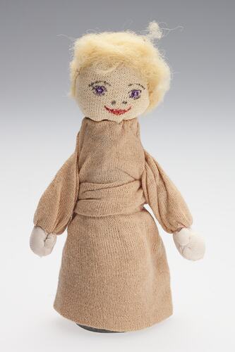 Small doll with cotton cone body, from a collection of handcrafts, produced by English migrant Ada Perry, between the 1930s and 1960s.