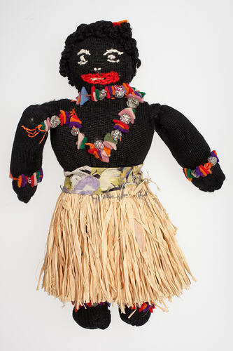 Knitted doll, which as been made using black wool. The doll is dressed in a rattan skirt, with a floral belt. The doll also wears a necklace and bracelets made from small scraps of different coloured felt. The eyes and mouth have been embroidered using white and red thread and the hair has been made using black wool.