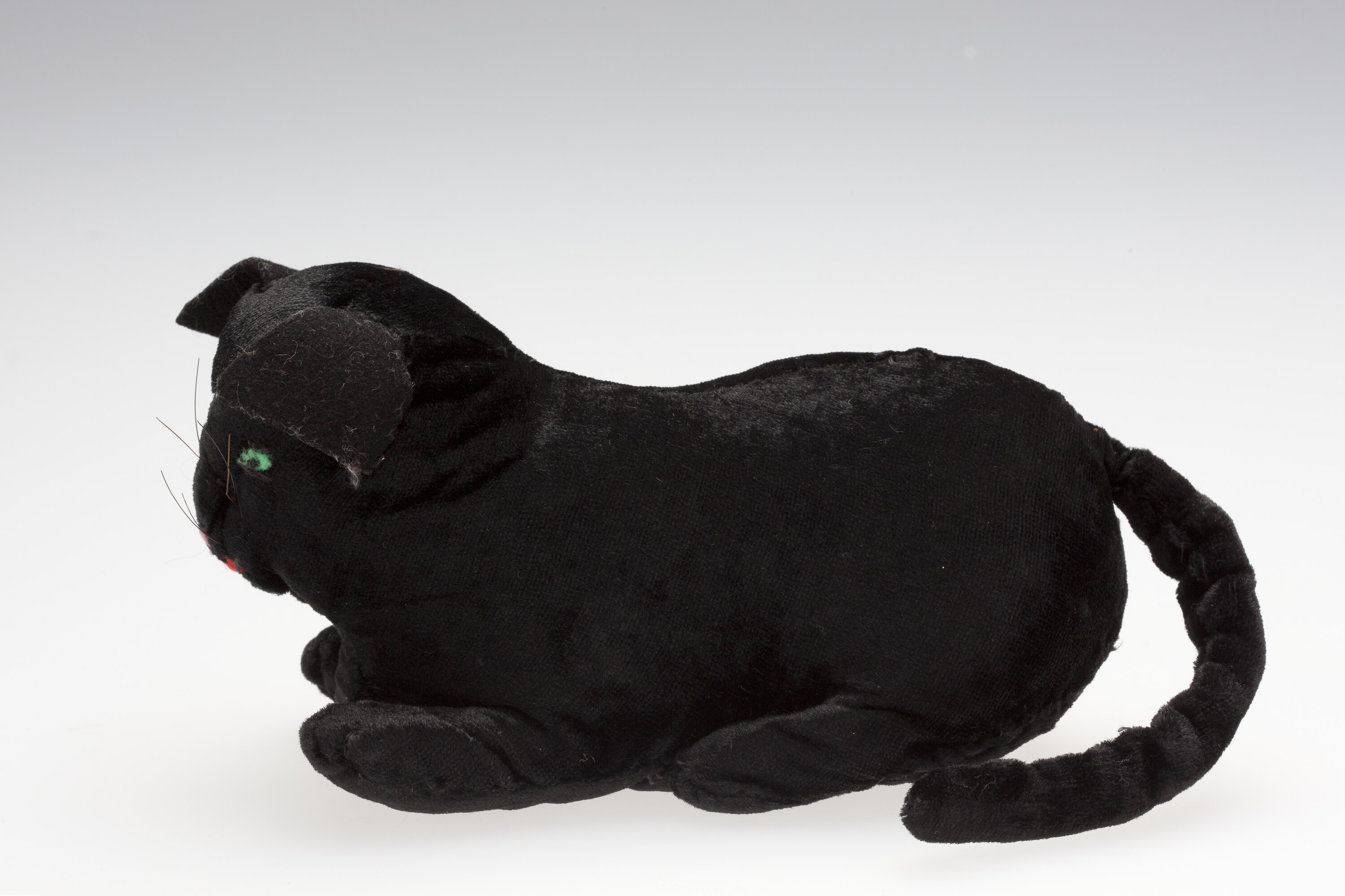 Soft toy cat made from black velvet with eyes embroidered in green and black, a mouth embroidered in red and a nose embroidered in pink. Whiskers have also been attached to the cat's face.