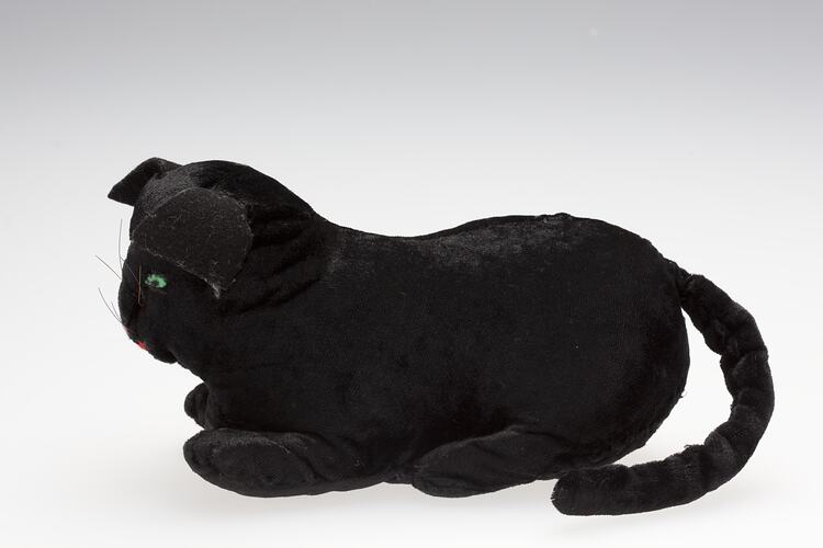 Black velvet cat, from a collection of handcrafts, produced by English migrant Ada Perry, between the 1930s and 1960s. Ada Perry migrated to Australia as a widow with eight children in 1924. She struggled to work a piece of isolated government allocated land at Mirboo North, until 1928 when a buggy accident left her unable to continue physical labour, so she created craft items, while her children worked the land. The items in the Museum's collection are prototypes, as she kept the first of anything she created for her children and then gave away the rest. All Ada's handcrafts were made using available scraps or reusing old clothes, providing insight into a domestic environment where subsistence was a struggle and where 'making do' was a matter of course.