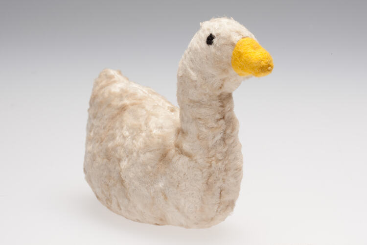 White plush goose, from a collection of handcrafts, produced by English migrant Ada Perry, between the 1930s and 1960s. Ada Perry migrated to Australia as a widow with eight children in 1924. She struggled to work a piece of isolated government allocated land at Mirboo North, until 1928 when a buggy accident left her unable to continue physical labour, so she created craft items, while her children worked the land. The items in the Museum's collection are prototypes, as she kept the first of anything she created for her children and then gave away the rest. All Ada's handcrafts were made using available scraps or reusing old clothes, providing insight into a domestic environment where subsistence was a struggle and where 'making do' was a matter of course.
