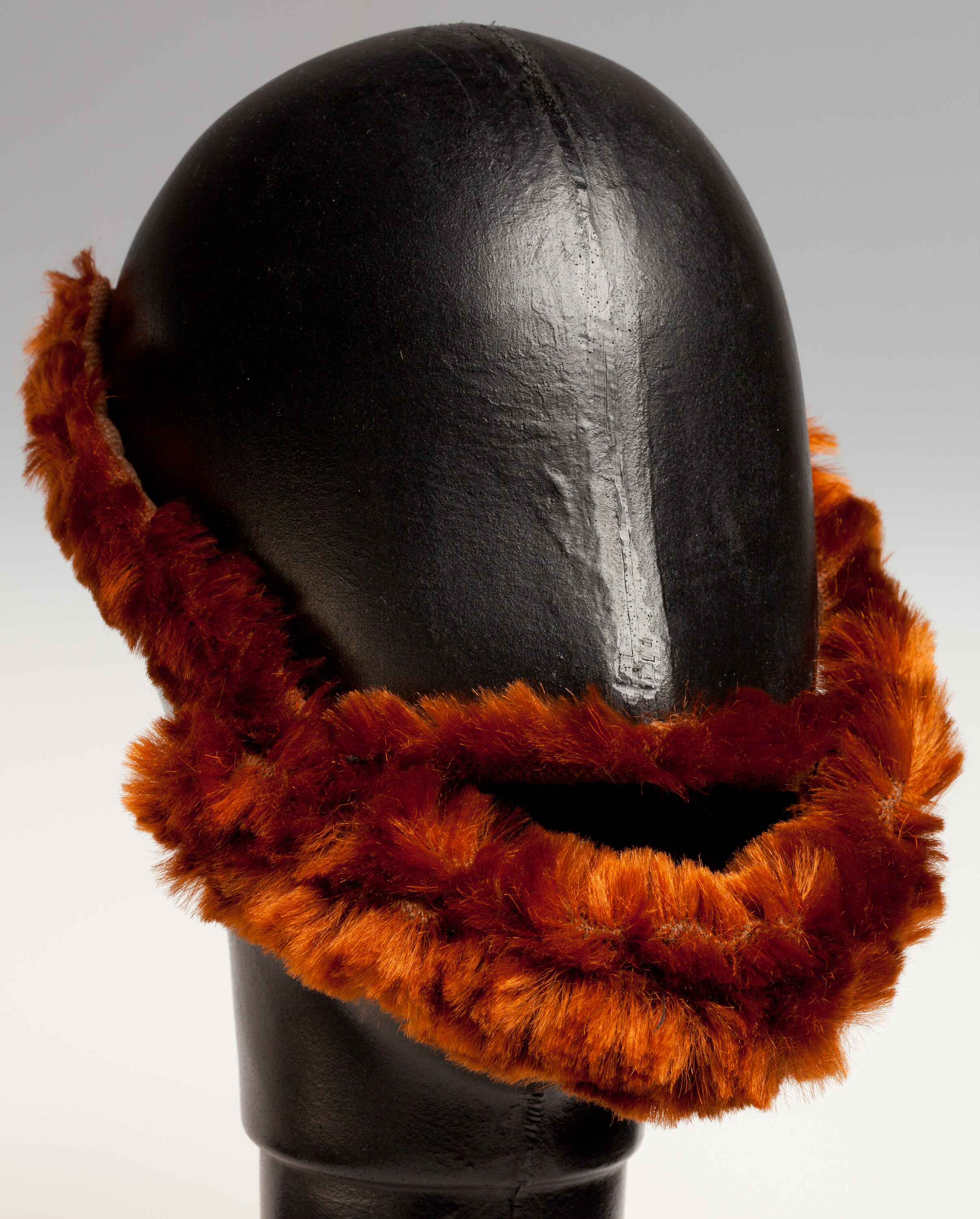 Beard made from dark brown fur. The beard is made to cover the wearer's chin and upper lip, leaving a space for the mouth. Sideburns which reach to the ear's complete the beard. The two sideburns are joined with elastic which allows the beard to be worn.
