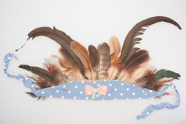 Feathered headdress for playing dress-ups, from a collection of handcrafts made by English migrant Ada Perry, between the 1930s and 1960s.