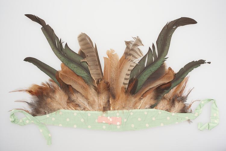 Feathered headdress for playing dress-ups, from a collection of handcrafts, produced by English migrant Ada Perry, between the 1930s and 1960s.