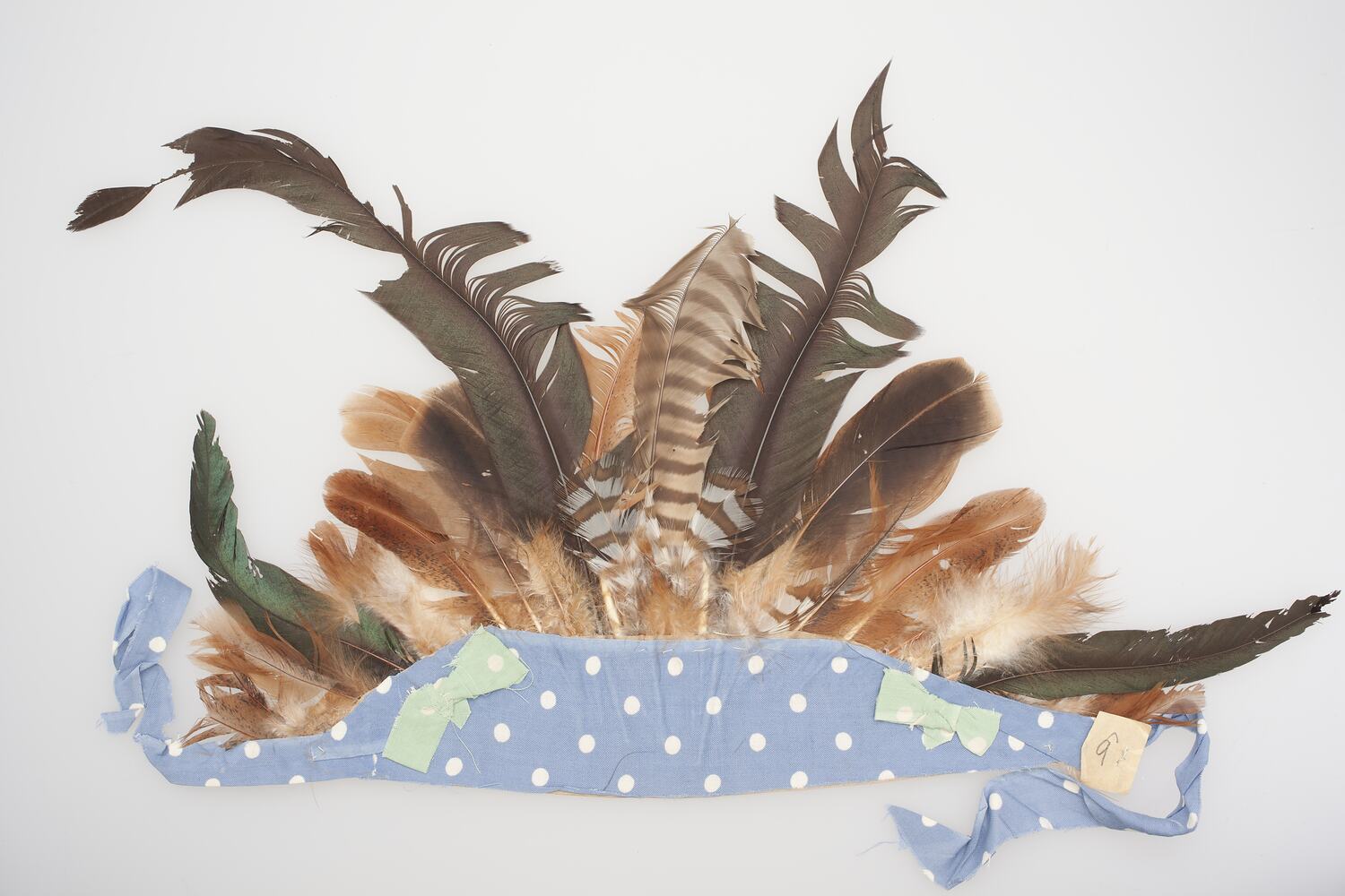 Headdress made by attaching a variety of feathers to a piece of blue and white spotted material. The material is wider and the front and narrows towards each end. A green and white bow has been attached each side of the headdress, at the front just before it narrows.