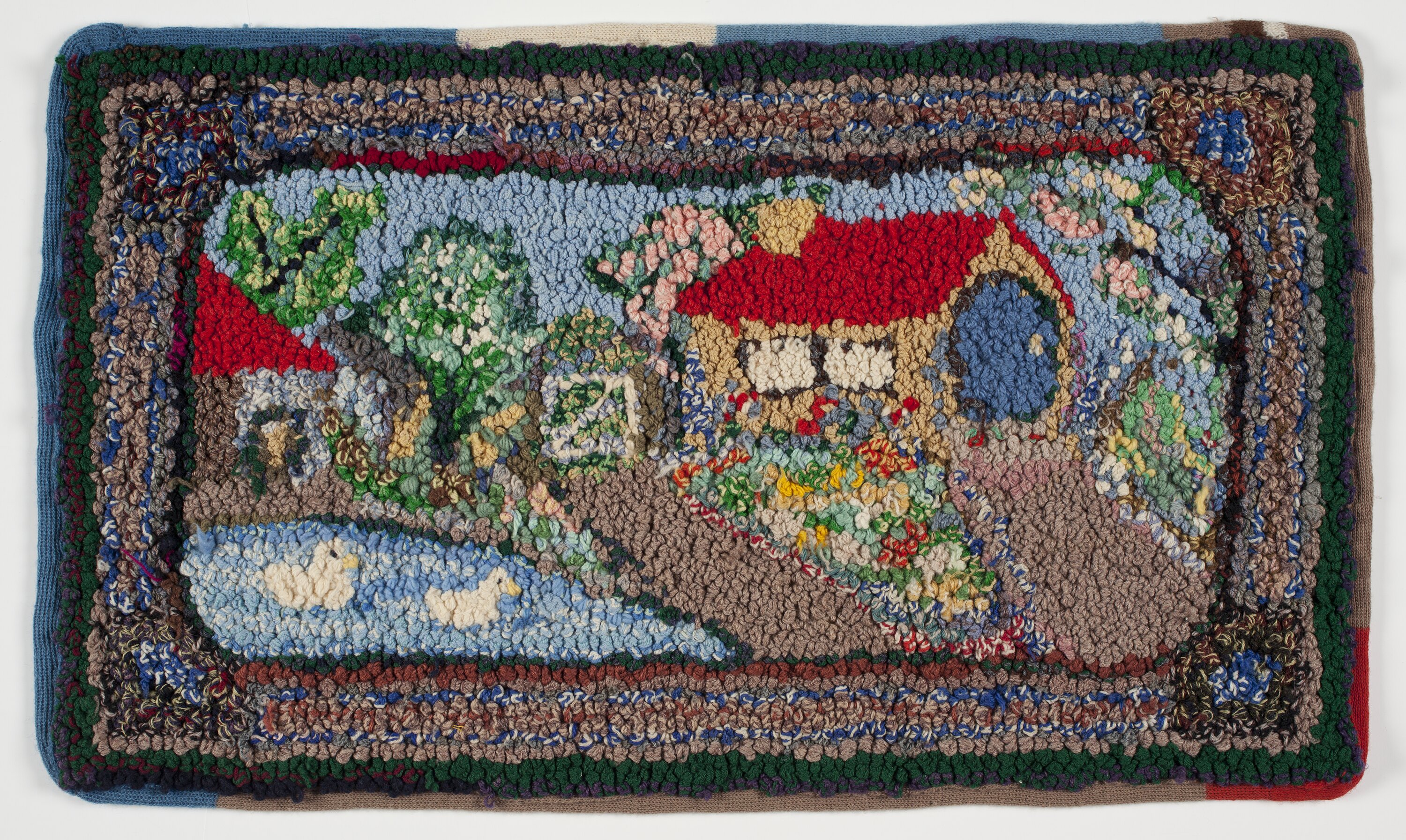 Rectangular woolen mat with scene of a two houses, one yellow the other brown, over looking a pond in which ducks are swimming. The mat has a boarder of brown and blue fabric.