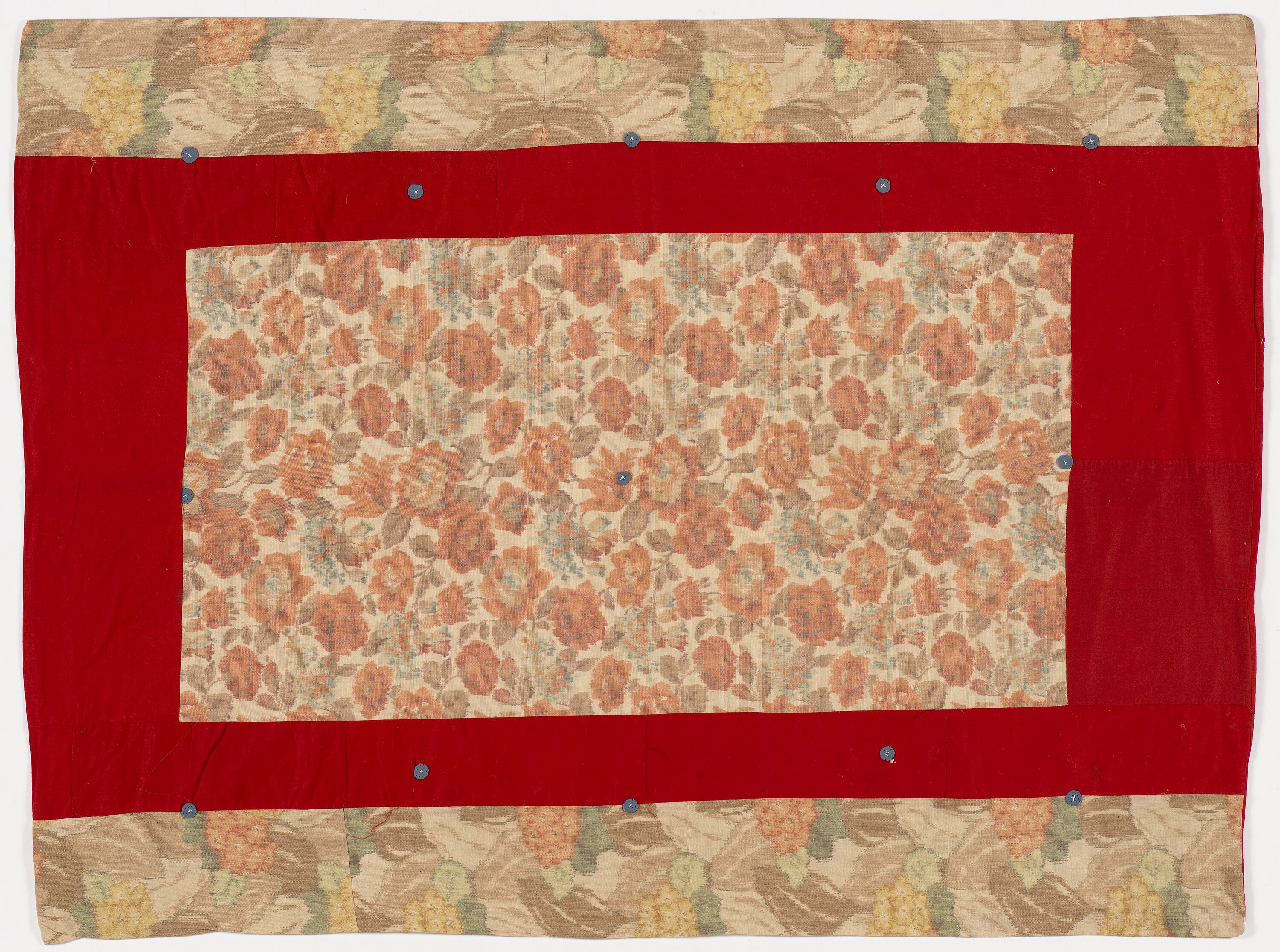 Red quilt with rectangular floral insert in the middle and strips of floral fabric along the two longer edges. The other side of the quilt has a smaller floral insert in a different pattern and blue dots sewn onto the red fabric.