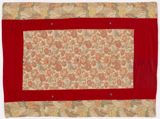 Red and cream floral patchwork quilt, from a collection of handcrafts, produced by English migrant Ada Perry, between the 1930s and 1960s.