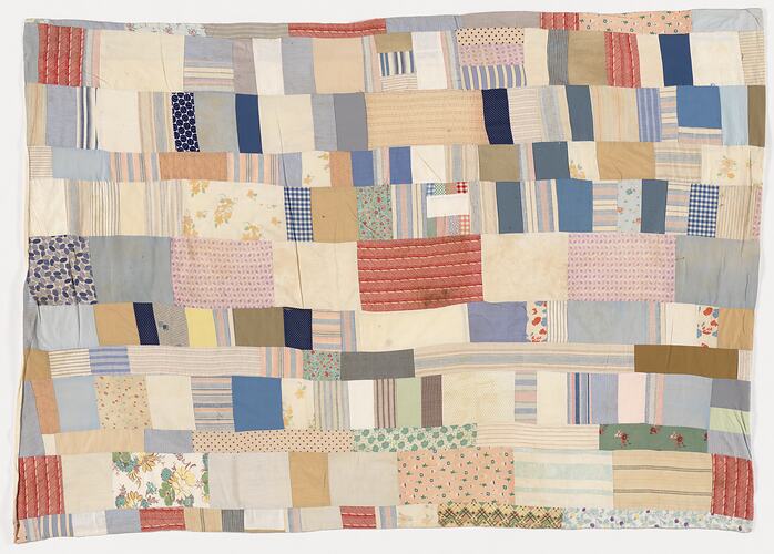 Patchwork quilt made from a collection of different sized rectangular pieces of fabric in a number of colours, patterns and fabrics.