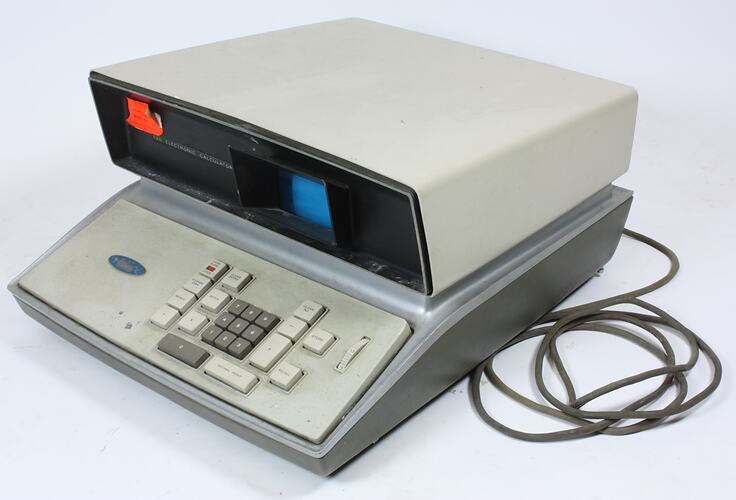 This is an early electronic calculator that was used from 1969 to 1979 at the Kiwi (Polish) Australia factory in South Clayton. The donor was sometime Factory Engineer and took this item with intention of building a cathode ray oscilloscope - something he clearly did not do. This model used transistors and its display is a cathode ray tube (CRT). It is a four function calculator. It is relatively large for such a limited use compared to the smaller four function calculators developed from 1975 onwards and ones that can be found in watches from the 1990s onwards.