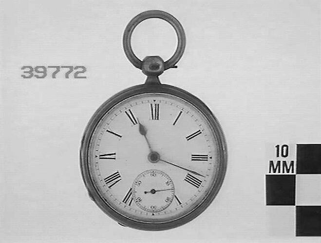 White enamel dial with roman numerals and seconds dial at six. Spring.
