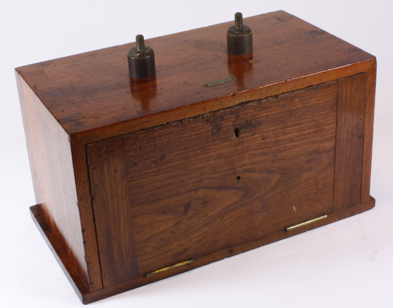 Dark brown polished wooden box 1with two insulated brass connectors on top. A door with lock (no key with object) allows access to inside. The internal sides are powdery whitish grey in colour. There is a unattached grey metal tray on the the base, with some greyish powder in the tray. Hanging from the top are two hemispherical elctrodes; the curved surfaces facing each other acrross a gap. The electrodes are connected through the top of the box to the two external connectors.