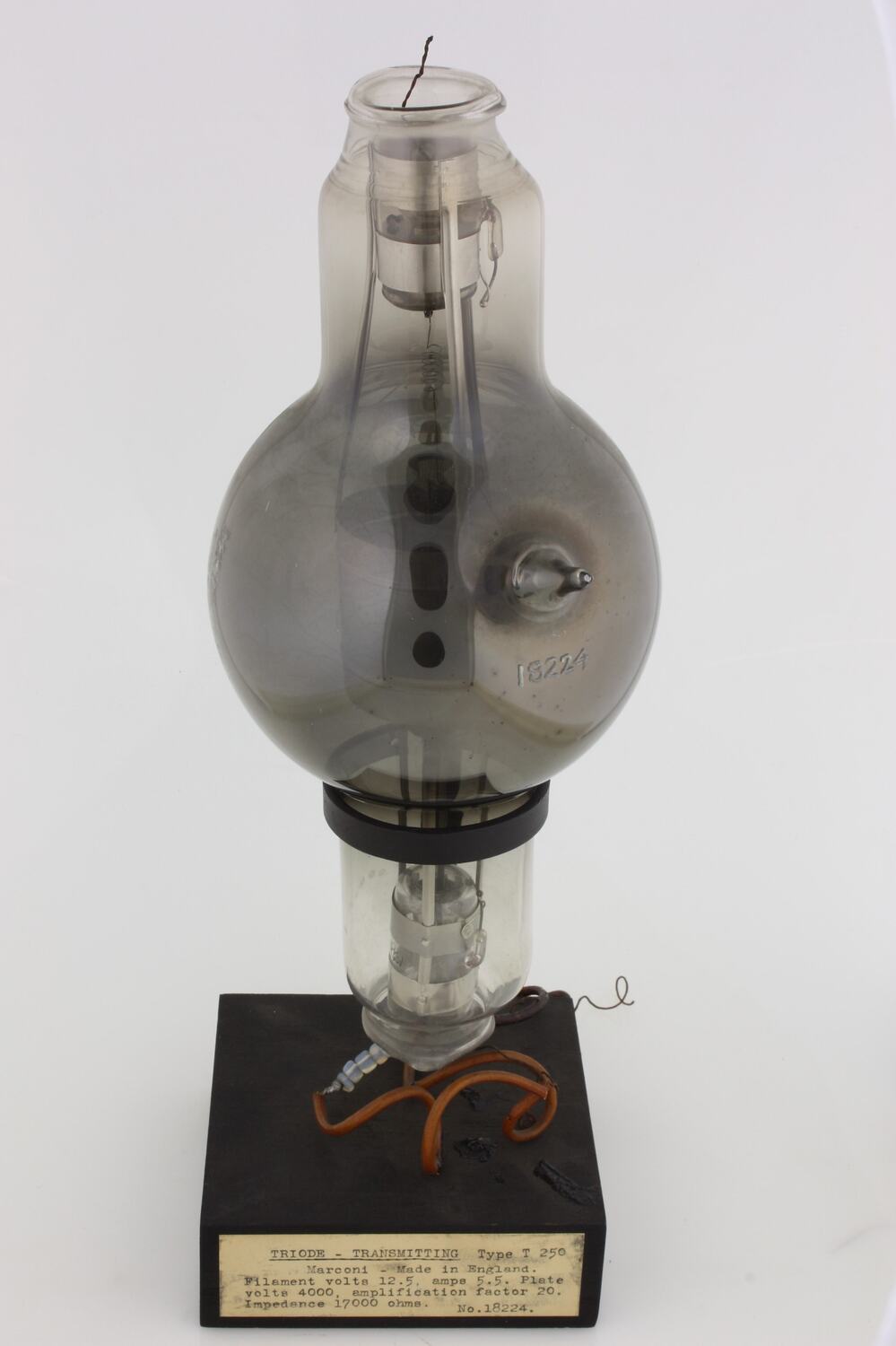 T250 triode, transmitting. Made by Marconi. circa 1922. Filament voltage was 12.5 volts at 5.5 amp. anode voltage was 4000 volts. total emission was 450 ma. impedence was 17000 ohms. amplification factor was 20. Used for radio transmission.
