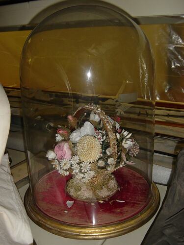 Ornament constructed from a variety of shell types, modelled to look like a bunch of flowers in a basket. It is an example of the type of handicrafts exhibited at Melbourne exhibitions; according to the donor, this ornament was exhibited at either the 1880 Melbourne International Exhibition or the 1888 Melbourne Centennial International Exhibition. The ornament is covered by a glass dome; such domes were a popular way of preserving such arrangements.