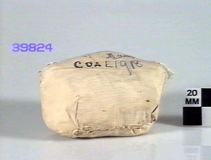 Piece of coal sewn up in linen marked 'Coal May 1918'. Donor not known. It has been suggested (by an unidentified person at Museums Victoria) that the coal was brought home by a Royal Australian Navy stoker.