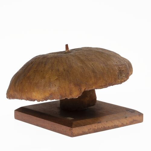 Wax model of a mushroom on a wooden mount.
