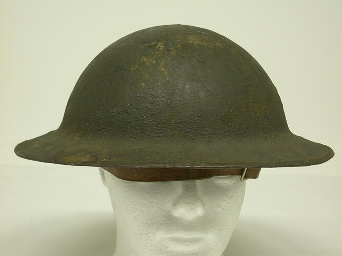 Steel helmet, 1914 British pattern. Photographs in the trenches of World War I depict Australian soldiers wearing similar helmets. Regimental colours of black and red are painted on the side of the helmet's crown, representing the Australian 5th Infantry Battalion.