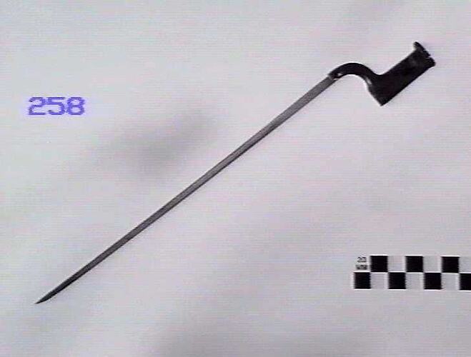 Bayonet, triangular blade, 432 mm long, fullered on two sides. Stamped on flat with Government proof mark for Birmingham.