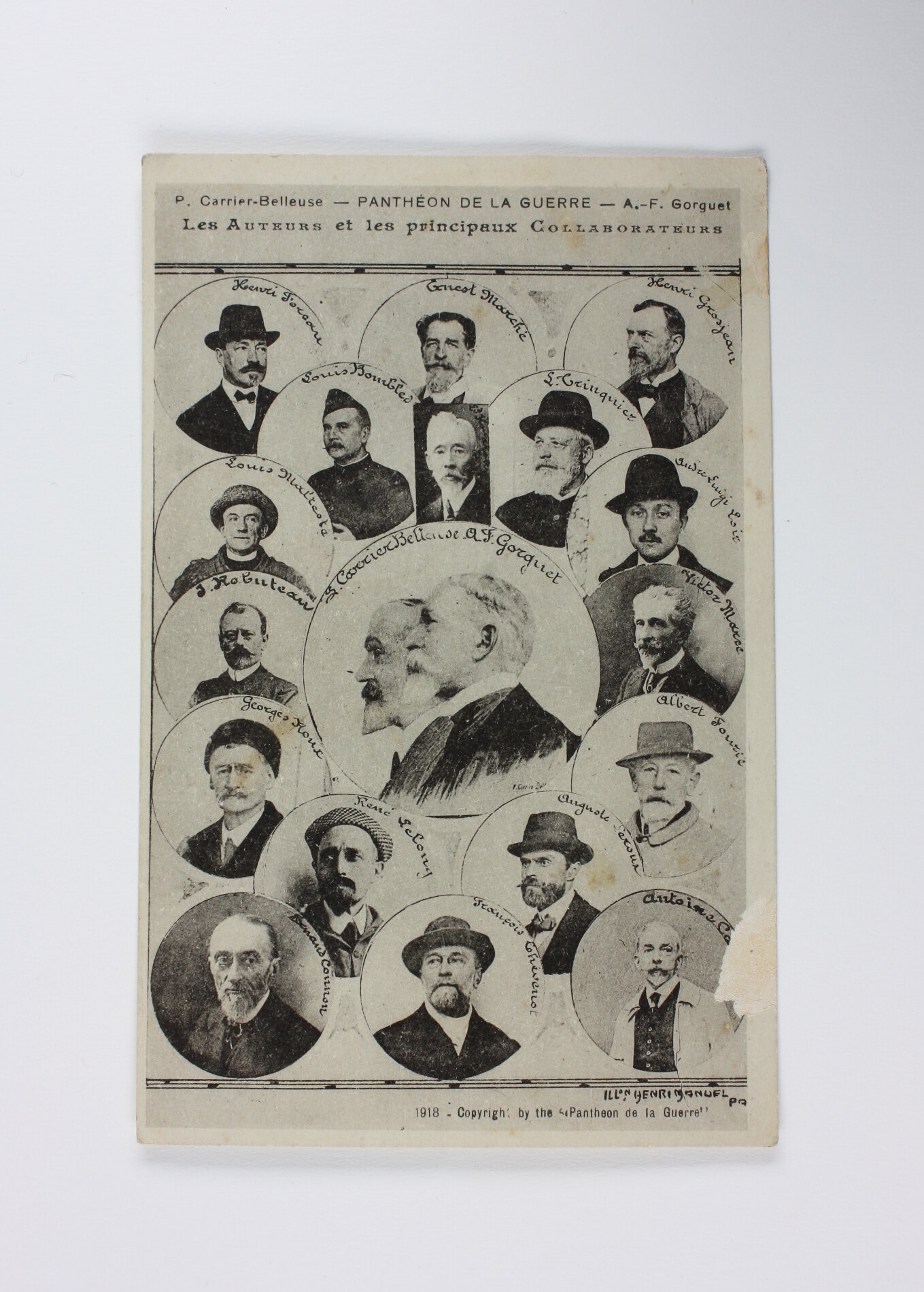 Printed: 'P. Carrier-Belleuse - PANTHEON DE LA GUERRE - A.'F. Gorguet / LES AUTEURS et les principaux COLLABORATEURS / / 1918 - Copyright by the "Pantheon de la Guerre'. Directly beneath image: ILLon HENRI MANUEL / PR'. [Translation: 'The authors and principal collaborators of the Pantheon of the War'.] Printed on back: 'CARTE POSTALE / CORRESPONDANCE / ADDRESSE / IMP LE DELEY, PARIS / Edit Art H. Manuel. Paris'.