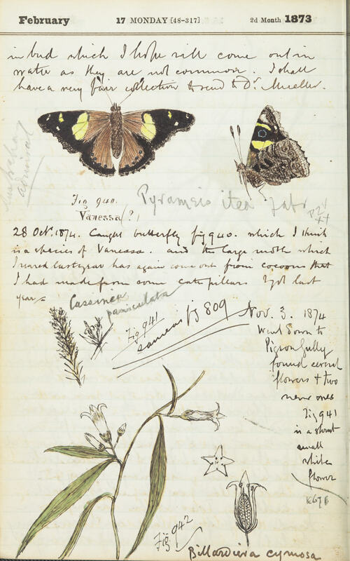 Maplestone was a postmaster by profession and these field notes cover Maplestone's observations in the field across Victoria as he moved from post to post. It covers the period January 1874 when he was stationed in Maryborough through to the 19th of December 1880 in Portland. It includes illustrations of plants, insects and fish and many observations of new species at the time. It also provides and insight into the naturalist network in Victoria at the time as he mentions often the advice he is seeking from various people around the state.