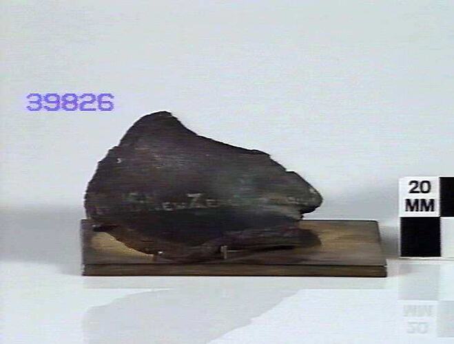 Fragment of shrapnel on a brass stand on inner side painted 'H.M.S. New Zealand 22/4/1916'. 'NZ' painted on outer side.