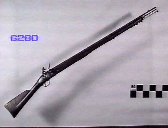 .753 inch calibre musket. Barrel 42 inches long, smooth bore. Steel blade foresight. Brass butt plate, trigger guard and pipes. Steel ramrod.