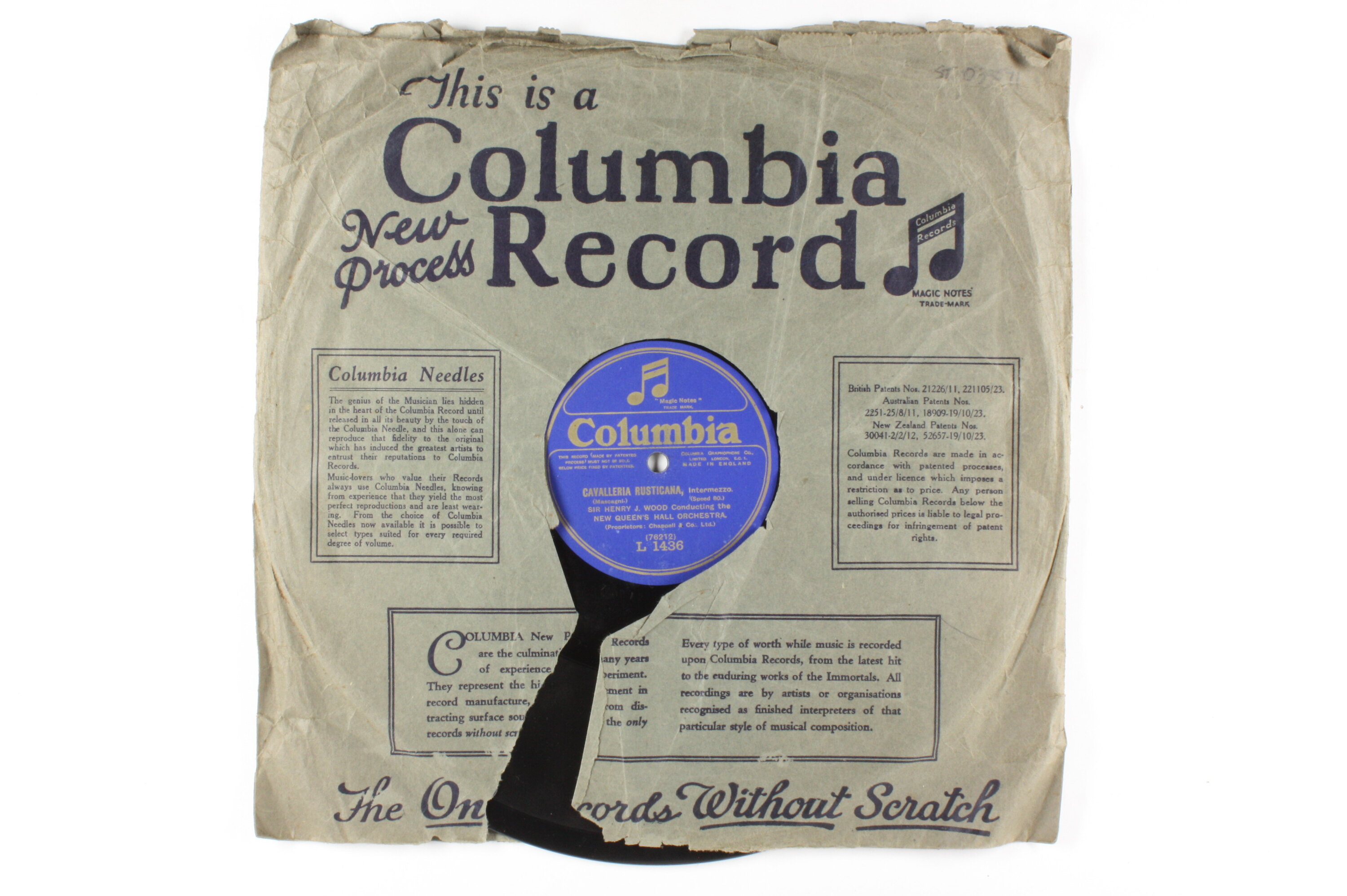Side A: "Magic Notes" / TTRADE MARK / Columbia / THIS RECORD (MADE BY PATENTED PROCESS) MUST NOT BE SOLD BELOW PRICE FIXED BY PATENTEES / COLUMBIA GRAPHOPHONE CO., / LIMITED LONDON, E.C. 1. / MADE IN ENGLAND / CAVALLERIA RUSTICANA, Intermezzo. / (Mascagni.) / (Speed 80.) / SIR HENRY J. WOOD Conducting the NEW QUEEN'S HALL ORCHESTRA. / (Proprietors: Chappell & Co., Ltd.) / (76212) / L 1436 Side B: "Magic Notes" / TTRADE MARK / Columbia / THIS RECORD (MADE BY PATENTED PROCESS) MUST NOT BE SOLD BELOW PRICE FIXED BY PATENTEES / COLUMBIA GRAPHOPHONE CO., / LIMITED LONDON, E.C. 1. / MADE IN ENGLAND / WILLIAM TELL, OVERTURE (in three parts.) / (d) Finale. / (Rossini.) / (Speed 80.) / SIR HENRY J. WOOD Conducting the NEW QUEEN'S HALL ORCHESTRA. / (Proprietors: Chappell & Co., Ltd.) / (74393) / L 1436 One Side Of Sleeve: This is a Columbia New Process Record (text and illustrations) Second Side of Sleeve: (text and illustrations)