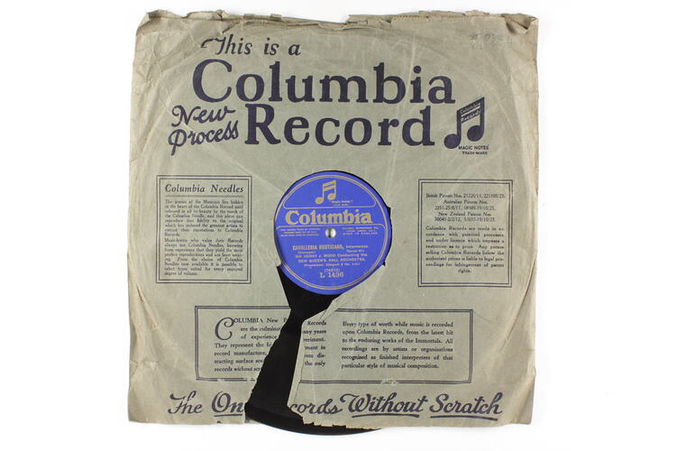 TYPE: COLUMBIA 12 IN. CONTENTS: "WILLIAM TELL OVERTURE" AND "INTERMEZZO- CAVALLERIA RUSTICANA", PLAYED BY NEW QUEENS HALL ORCHESTRA CONDUCTED BY SIR HENRY J. WOOD. COMPANY: TYPE DETAILS: DOUBLE SIDED. BLUE LABEL. COMMENTS: CAT. NO. L1436. RECORDED 1920 TO MID 1930'S. FORMERLY REGISTERED AT ST 028309. THAT NUMBER NOW CANCELLED.