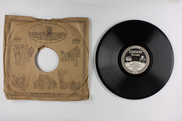 Edison double sided diamond disc recording (10 in). Side A: 'Indian Dawn' Charlies O. Roos & J.S. Zamecnik, soprano sung by Anna Case. Side B: 'Indian Love Call' from Rose -Marie, suprano sung by Anna Case. Produced by Edison, United States. Technology: Edison Diamond Disc. Classification: Popular Vocal. Year Recorded: 1925. Year Pressed: 1925 - 1929.