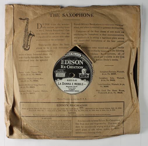 Side A: INDEX No. / EDISON RECORD / A PRODUCT OF THE EDISON LABORATORIES / 83013-L / Explanatory Talk / HARRY E HUMPHREY / PRICE $2.00 in the U.S.A. / 2551 Side B: INDEX No. / EDISON RECORD / A PRODUCT OF THE EDISON LABORATORIES / 83013-R / La Donna E Mobile - / Rigoletto (Verdi) / Tenor Solo / In Italian / ALESSANDRO BONCI / PRICE $2.00 in the U.S.A. / 2278 Paper Sleeve Side A: EDISON RECORD / COMPARISION WITH THE LIVING ARTIST REVEALS NO DIFFERENCE / <drawings of characters in opera performances> Paper Sleeve Side B: <listing of various perfomances availabe on Edison Records>