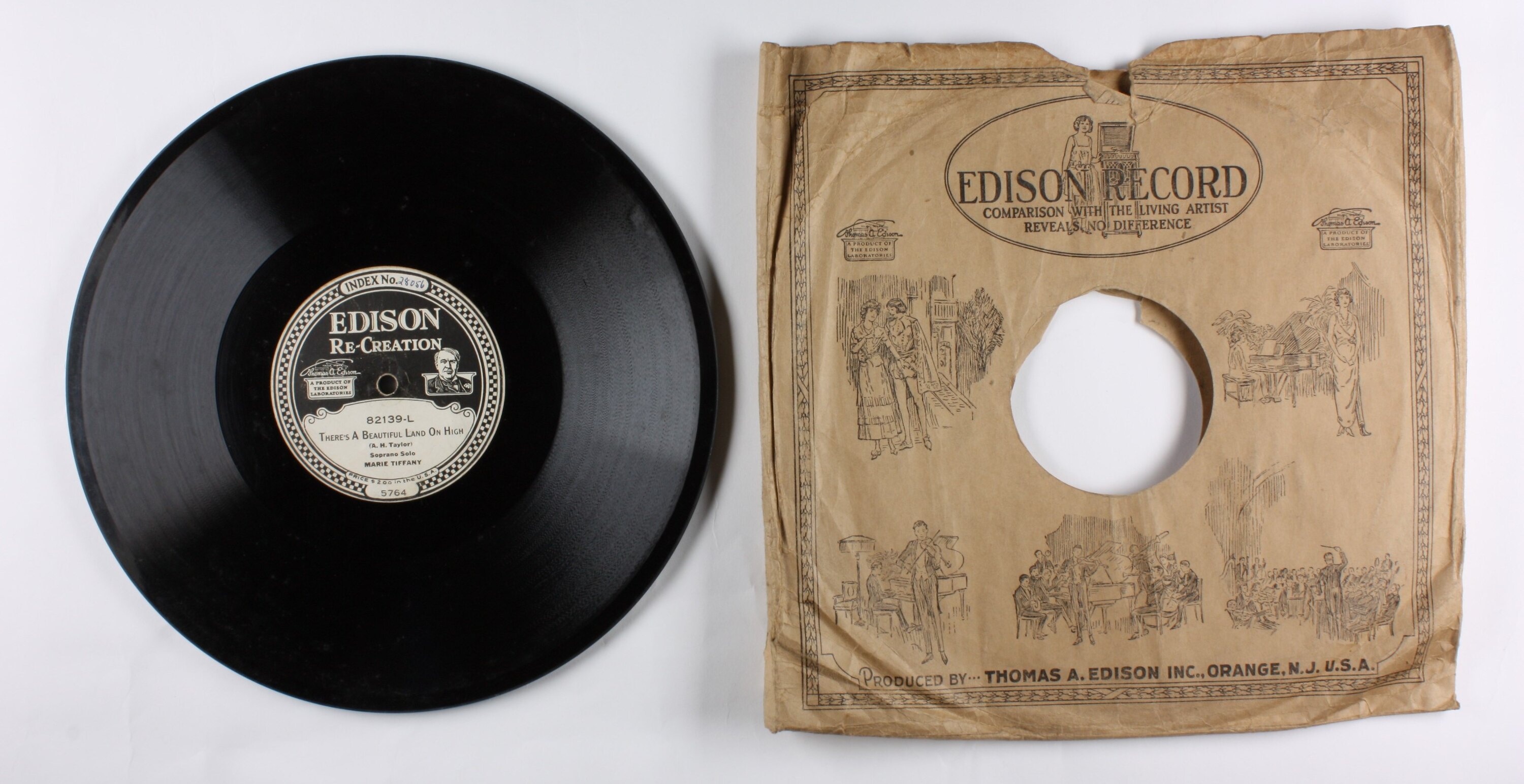 Side A: INDEX NO. 28056 / EDISON RE-CREATION / A PRODUCT OF THE EDISON LABORATORIES / 82139-L / THERE'S A BEAUTIFUL LAND ON HIGH / (A.H. Taylor) / Soprano Solo / MARIE TIFFANY / PRICE $2.00 in the U.S.A. / 5764 Side B: EDISON RE-CREATION / A PRODUCT OF THE EDISON LABORATORIES / 82139-R / COME UNTO HIM / Messiah (G.F. Handell) / Soprano Solo / MARIE TIFFANY / PRICE $2.00 in the U.S.A. / 6014 One side of sleeve: EDISON RECORD / (text and illustrations) Second side of sleeve: (text) / (Patents - list of years latest1918) / (text)