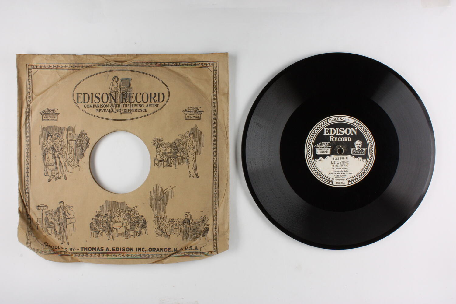 Side A: INDEX No. 28051 / EDISON RECORD / A PRODUCT OF EDISON LABORATORIES / 52355-L / TARANTELLE / (David Popper, Op. 33.) / Violincello Solo / CORNELIUS VAN VLIET / JOSEF ADLER / ar the Piano / Made in U.S.A. / 18605. Side B: INDEX No. 28051 / EDISON RECORD / A PRODUCT OF EDISON LABORATORIES / 52355-R / LE CYGNE / (THE SWAN) / (C. Saint-Saens) / Violincello Solo / CORNELIUS VAN VLIET / JOSEF ADLER / ar the Piano / Made in U.S.A. / 18604. One side of sleeve: EDISON RECORD / (text and illustrations). Second side of sleeve: (text) / (Patents - list of years latest1918) / (text) Cat. No. 52355 R & L. Matrix Nos. 18604 and 18605