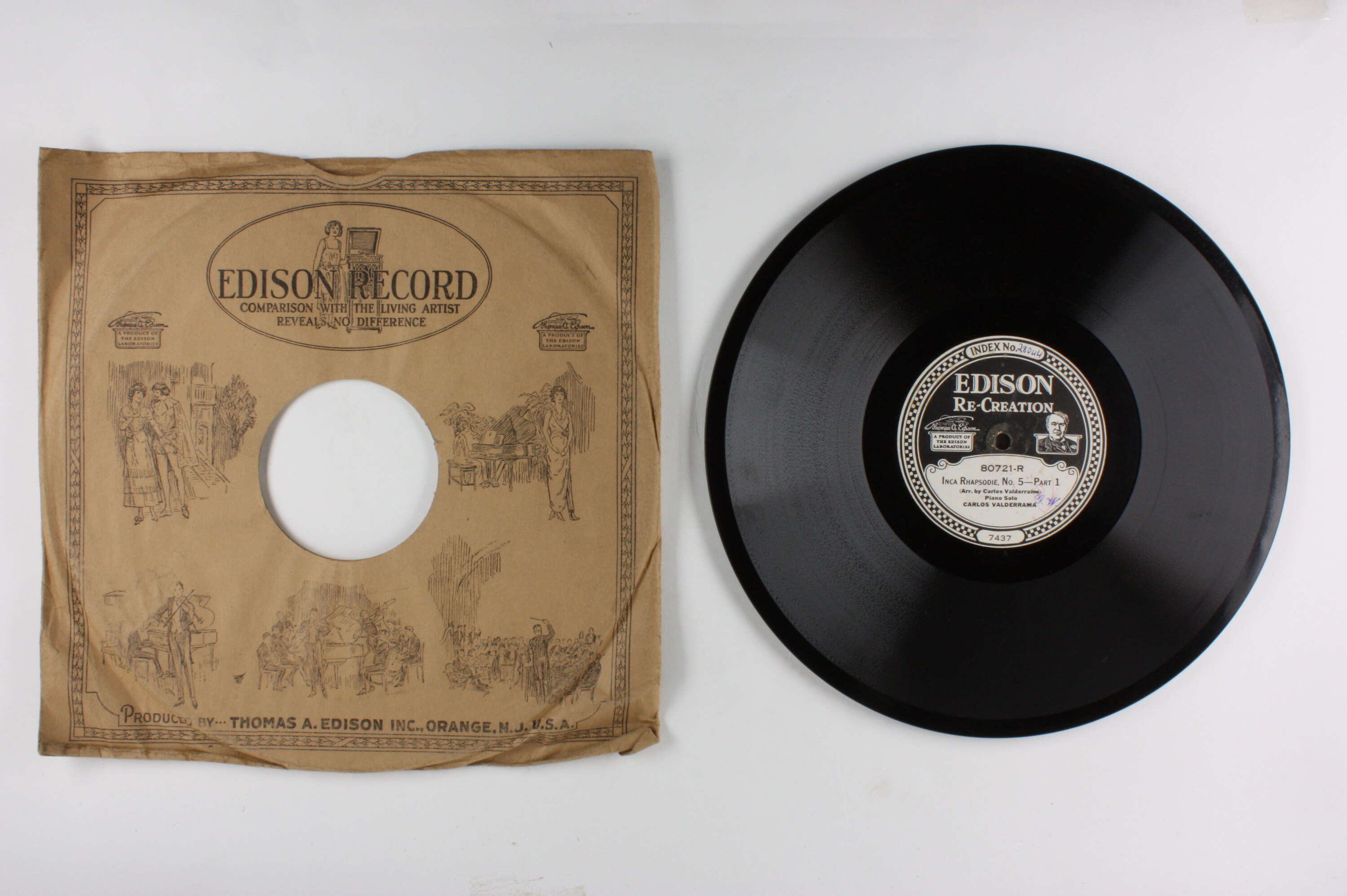 TYPE: EDISON DIAMOND 10 IN. CONTENTS: "INCA RHAPSODIE NO. 5, OPUS 11 PARTS 1 AND 2", ARRANGED AND PLAYED BY CARLOS VALDERRAMA ON PIANO. COMPANY: EDISON CO., U. S. A. TYPE DETAILS: DOUBLE SIDED. COMMENTS: CAT. NO. 80721 R & L. MATRIX NOS. 7437 AND 7440.