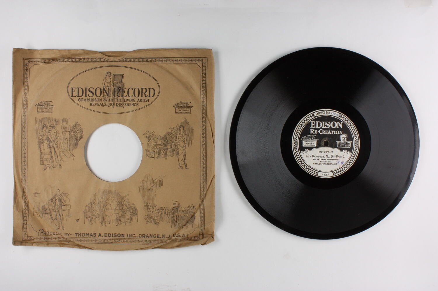 Side A: INDEX No. 28044 / EDISON RE-CREATION / A PRODUCT OF EDISON LABORATORIES / 80721-R / INCA RHAPSODIE, NO. 5--PART 1 / (Arr. by Carlos Valderrama) / Piano Solo / CARLOS VELDERAMMA / 7437 Side B: INDEX No. 28044 / EDISON RE-CREATION / A PRODUCT OF EDISON LABORATORIES / 80721-L / INCA RHAPSODIE, NO. 5--PART 2 / (Arr. by Carlos Valderrama) / Piano Solo / CARLOS VELDERAMMA / 7440 One side of sleeve: EDISON DIAMOND DISC RE-CREATION / (text and illustrations) Second side of sleeve: (text) / (Patents - list of years latest1918) / (text) Cat. No. 80721 R & L. Matrix Nos. 7437 and 7440
