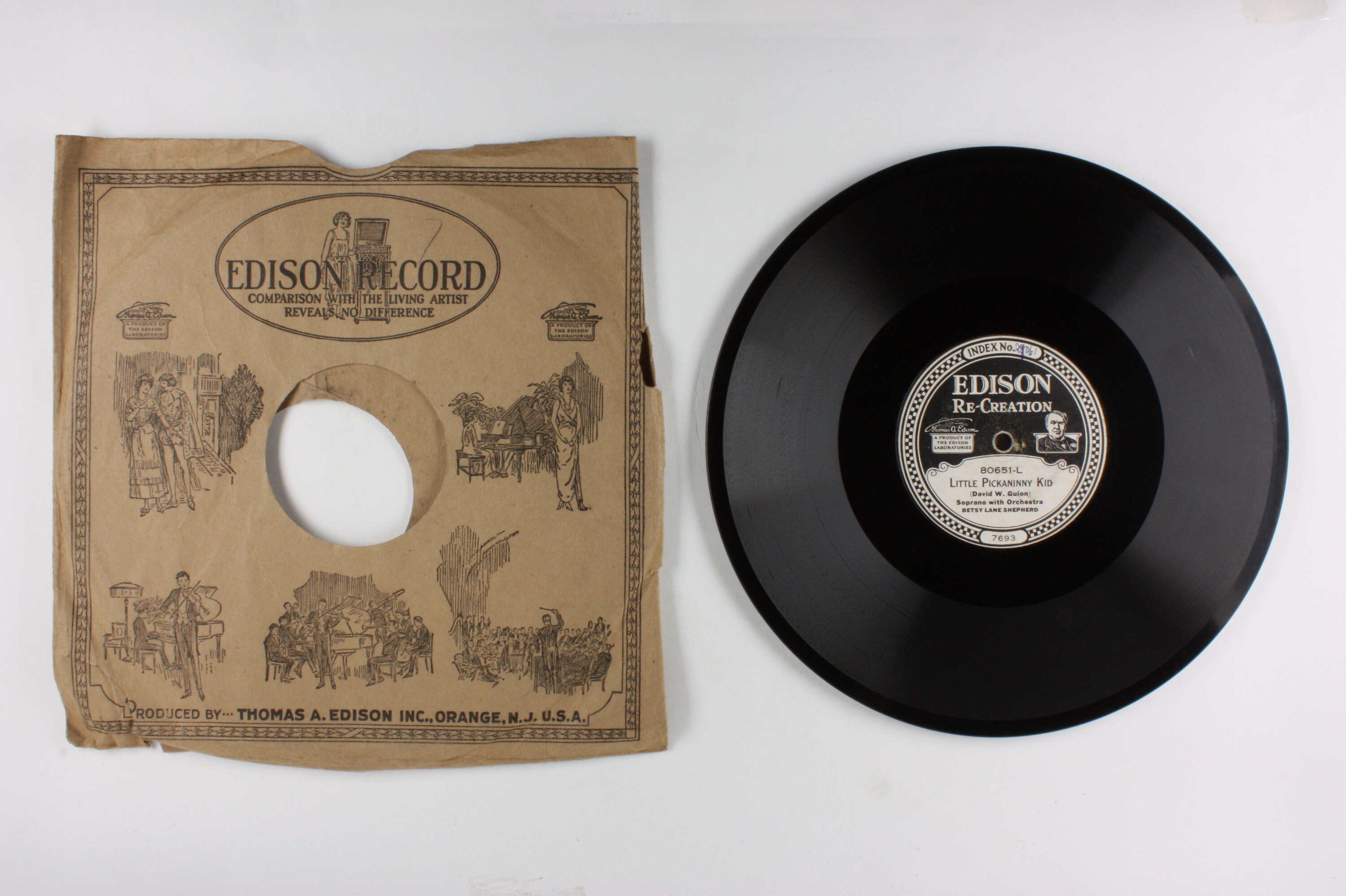 Side A: INDEX No. 28061 / EDISON RE-CREATION / A PRODUCT OF EDISON LABORATORIES / 80651-L / LITTLE PICKANINNY KID / (David W. Guion) / Soprano with Orchestra / BETSY LANE SHEPHERD / 7693 Side B: INDEX No. 28061 / EDISON RE-CREATION / A PRODUCT OF EDISON LABORATORIES / 80651-R / HONEY BABE / (Vaughn de Leath) / Male Voices Unaccompanied / CRITERION QUARTET / 7581 One side of sleeve: EDISON RECORD / (text and illustrations). Second side of sleeve: (text) / (Patents - list of years latest1918) / (text) Cat. No. 80651 R & L. Matrix Nos. 7581 and 7693