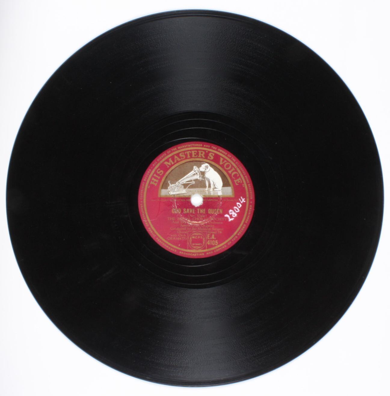 Side A: HIS MASTER'S VOICE / GOD SAVE THE QUEEN / MANUFACTURED SPECIALLY FOR THE / (central hole) / GRAMOPHONE Co Ltd. Sydney NSW / OEA16477 / E.A. 4105 Side A inscribed in recording surface: OEA 16477-2G Side B: HIS MASTER'S VOICE / GOD SAVE THE QUEEN / (a) Full Verse (b) Half Verse / MANUFACTURED SPECIALLY FOR THE / (central hole) / GRAMOPHONE Co Ltd. Sydney NSW / OEA16479 / E.A. 4105 Side B inscribed in recording surface: OEA 16479-1C