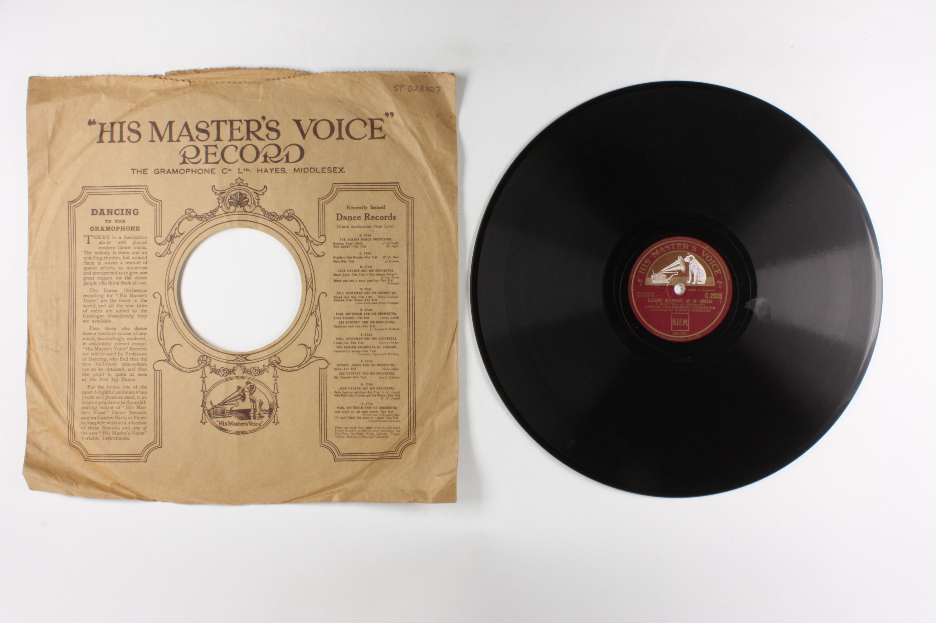 Side A: (text) / "HIS MASTER'S VOICE" / No. 1 / (illustration) / Made in England / Orchestra SPEED 78 C.2935 / ELEGIAC MELODIES, OP. 34 (GRIEG) / 1. Heart Wounds (Hjartesar) / LONDON PHILHARMONIC ORCHESTRA / conducted by EUGENE GOOSSENS / (illustration) / 2EA.5311 / THE GRAMOPHONE CO. LTD Side B: (text) / "HIS MASTER'S VOICE" / No. 1 / (illustration) / Made in England / Orchestra SPEED 78 C.2935 / ELEGIAC MELODIES, OP. 34 (GRIEG) / 1. Heart Wounds (Hjartesar) / LONDON PHILHARMONIC ORCHESTRA / conducted by EUGENE GOOSSENS / (illustration) / 2EA.5312 / THE GRAMOPHONE CO. LTD One side of sleeve: "HIS MASTER'S VOICE RECORD" / (illustration) / (text) Second side of sleeve: (text) / (illustration) / (text)