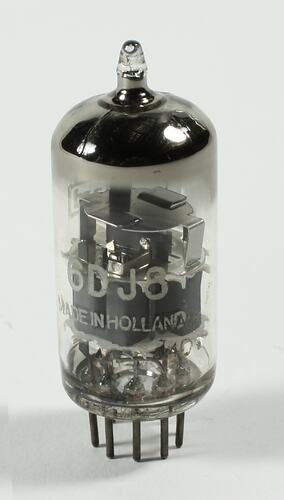 Twin triode designed for use as a cascode RF amplifier in VHF television tuners. Alternative designation is ECC88. 6.3V indirectly heated cathode.