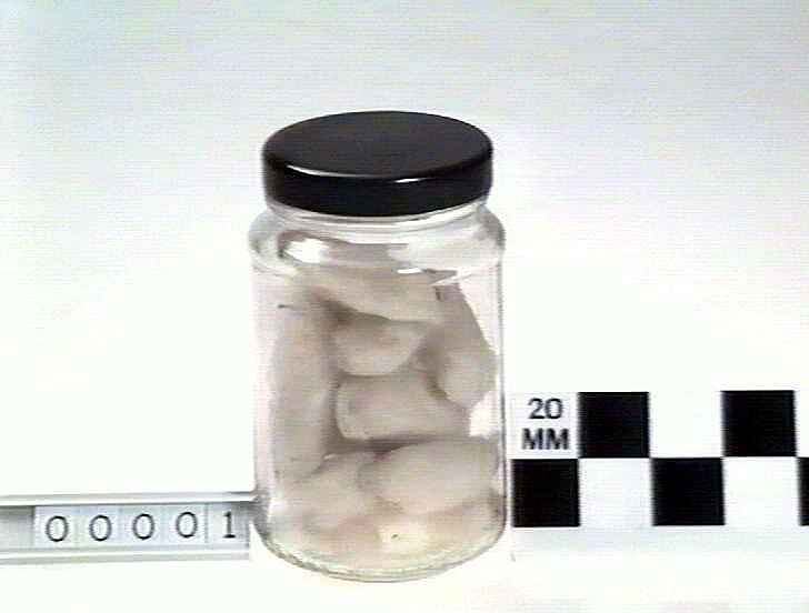 A sample of silk cocoons from the "Eria" or "Arrindi" silkworm of India. Silkworms from Attacus ricini (N. O. Lepidoptera). Their natural food is Ricinus communis (castor oil tree).