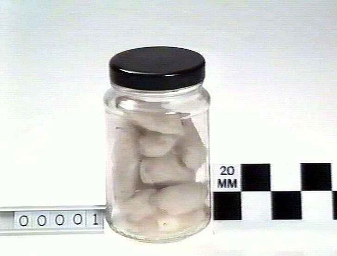 The silkworms from which these cocoons are made were reared by the donor at Hawthorn, Melbourne, using imported eggs during the 1894 season. They were presented to the museum by him, when he was Secretary of the Victorian Silk Culture Association, on 19 December 1895. An original card catalogue entry reads that George Francis Hampson's volumes on Lepidoptera in Fauna of British India (1892 - 1896) "gives Attacus cynthia, Drury, as the "Eria" silkworm but in letters from India Agri. Research Inst.15/12/20 they are stated to be distinct varieties. Some hold opinion A. ricini is the wild form."