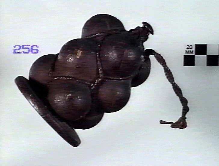 Grape shot, quilted. 32 pr. muzzle loading gun. Iron plate with central spindle around which is grouped 9 shot in 3 tiers. Shot enclosed in canvas bag, the bag being drawn together between the balls by strong cord.