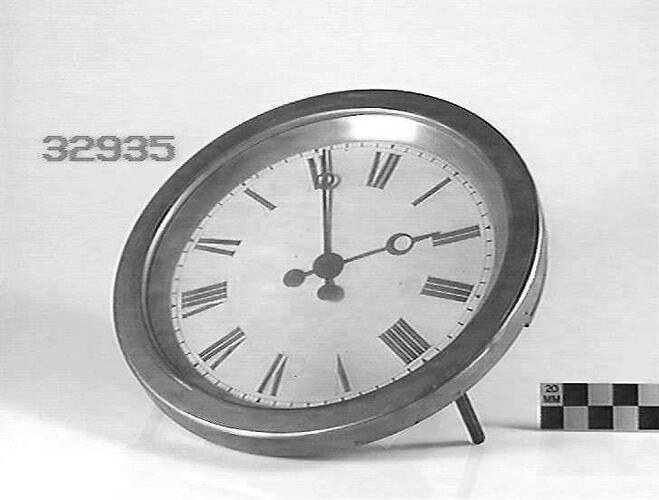 Round plated wall clock. White dial has roman numerals. Works protected by round metal case on back. Horse- shoe magnet oscillates between two pairs of coils. Operated by pulse from master clock.