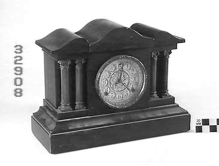 Mantel clock, black wooden case with brass Corinthian columns. Made by Sessions Clock Co, Forestville, Connecticut, circa 1910.