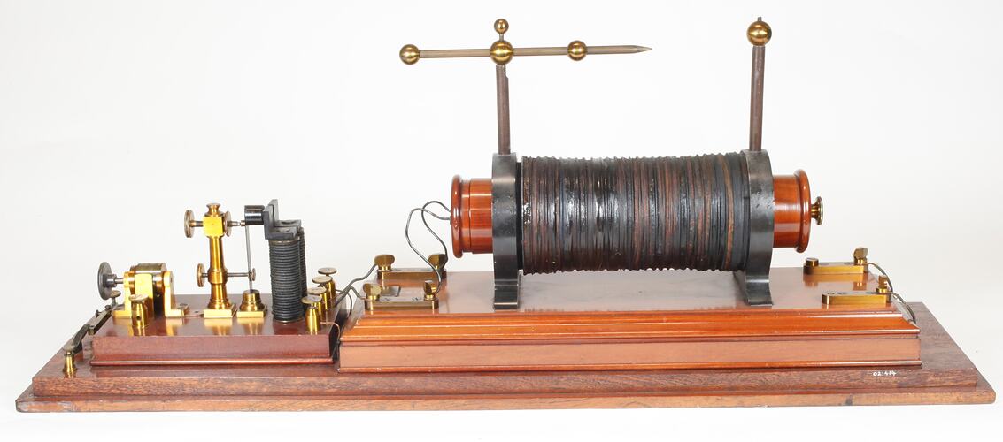 Two devices, one larger and one smaller, are each mounted on separate polished wooden bases, which are mounted on a single polished wooden base. A third device is mounted directly onto the main base. The larger device (induction coil) contains a large black coil with a vertical brass pillar at each end. One pillar (to the centre of the whole instrument )has a perpendicular brass rod in it with a pointed end facing towards the other pillar, whic does not have a pointed horizontal rod. Two terminals at the end of the coil lead into the main base, while on the other end of the coil, two leads connect to the medium sized device. The medium size device consists of an interupter and a reversing switch. The interupter consists of a pair of coils and a spring mounted armature with one pairs of contacts and an adjusting screw for a rest position of the armature. A plastic bag, attached to the object, contains a screw.