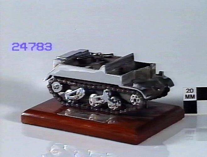 Plated steel presentation model of a Bren Gun Carrier is mounted on a wooden base with a plate reading ' Presented to R.C. Evans, Esq. to Mark the Completion of 420 Machine Gun Carriers by the Construction Department the Metropolitan Gas Company April 1942.' It was donated to the Museum by Dr R.S. Andrews in 1960.