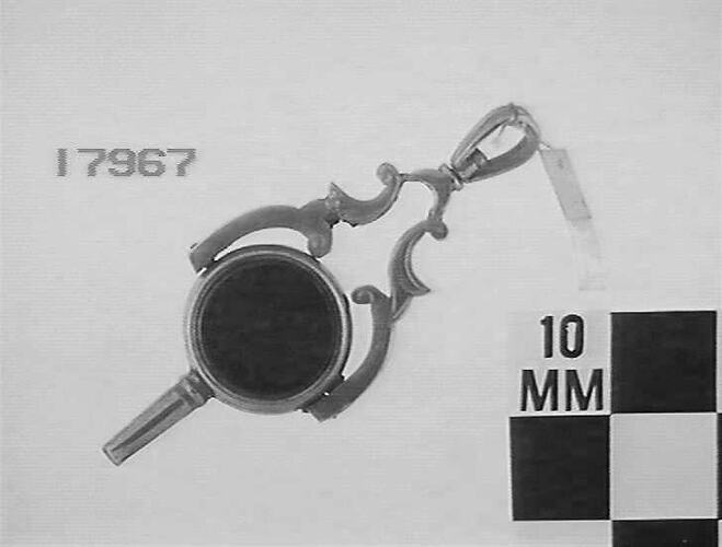 Gilt, round pivoted body set with carnelian and bloodstone.