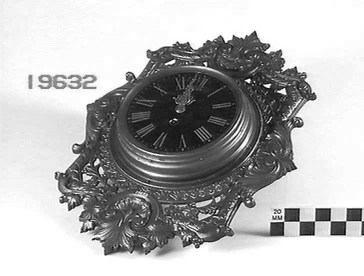 Black dial in bronzed ornate iron mount ornamented with floral motifs. Gilt hands and roman numerals. Spring wound.