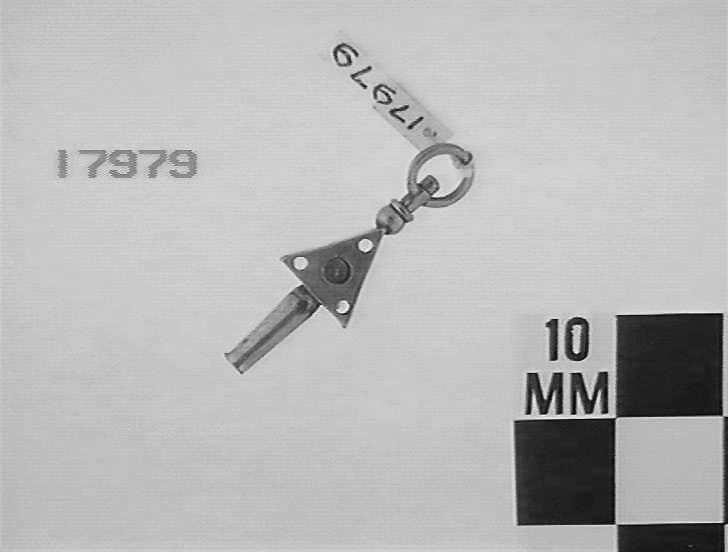 Gilt, triangular body perforated with four holes.