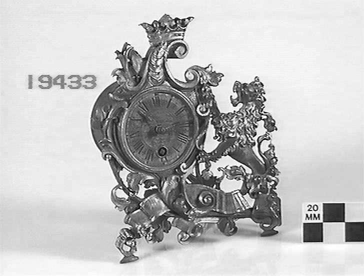 Round metal clock mounted in an ornate bronzed and gilded stand, with sheet metal backing.