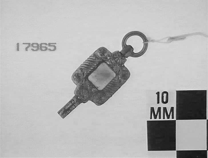 Gilt, chased square body set with pink glass. Poor workmanship and imitation stone.